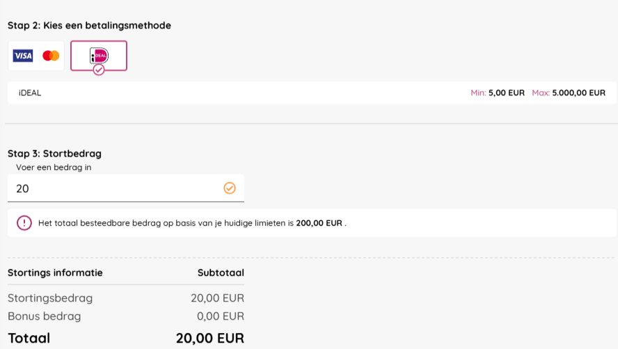 Stap 3: Kies je betaalmethode (iDEAL of Visa/Mastercard) en vul het bedrag in dat je wilt storten. Het minimale stortingsbedrag is € 5, tot maximaal € 5000 (als je stortingslimiet dat toestaat). Druk daarna op 'Storting'.