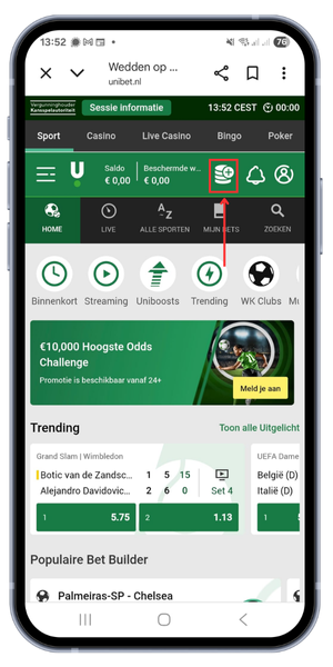 Log in bij Unibet en druk op het muntjes-icoontje. Dit icoontje staat in de rechterbovenhoek van je beeldscherm. Dit is de toegang tot de Unibet betalingsopties.