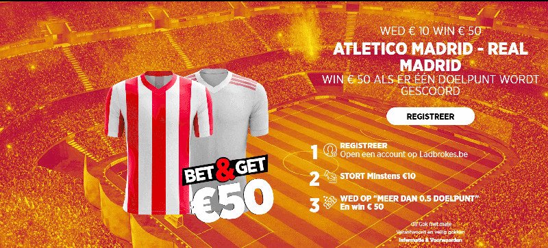 Ladbrokes heeft een heerlijke promotie (voor nieuwe klanten) voor de wedstrijd Atletico Madrid - Real Madrid, komende zondag 7 maart 16:15 👉Zet €10 in en win €50 als er minimaal 1x gescoord gaat worden (Over 0.5). En die kans is best groot.