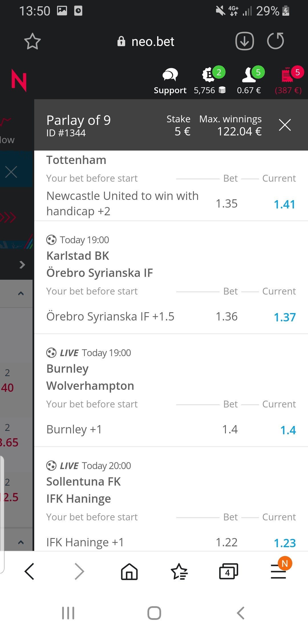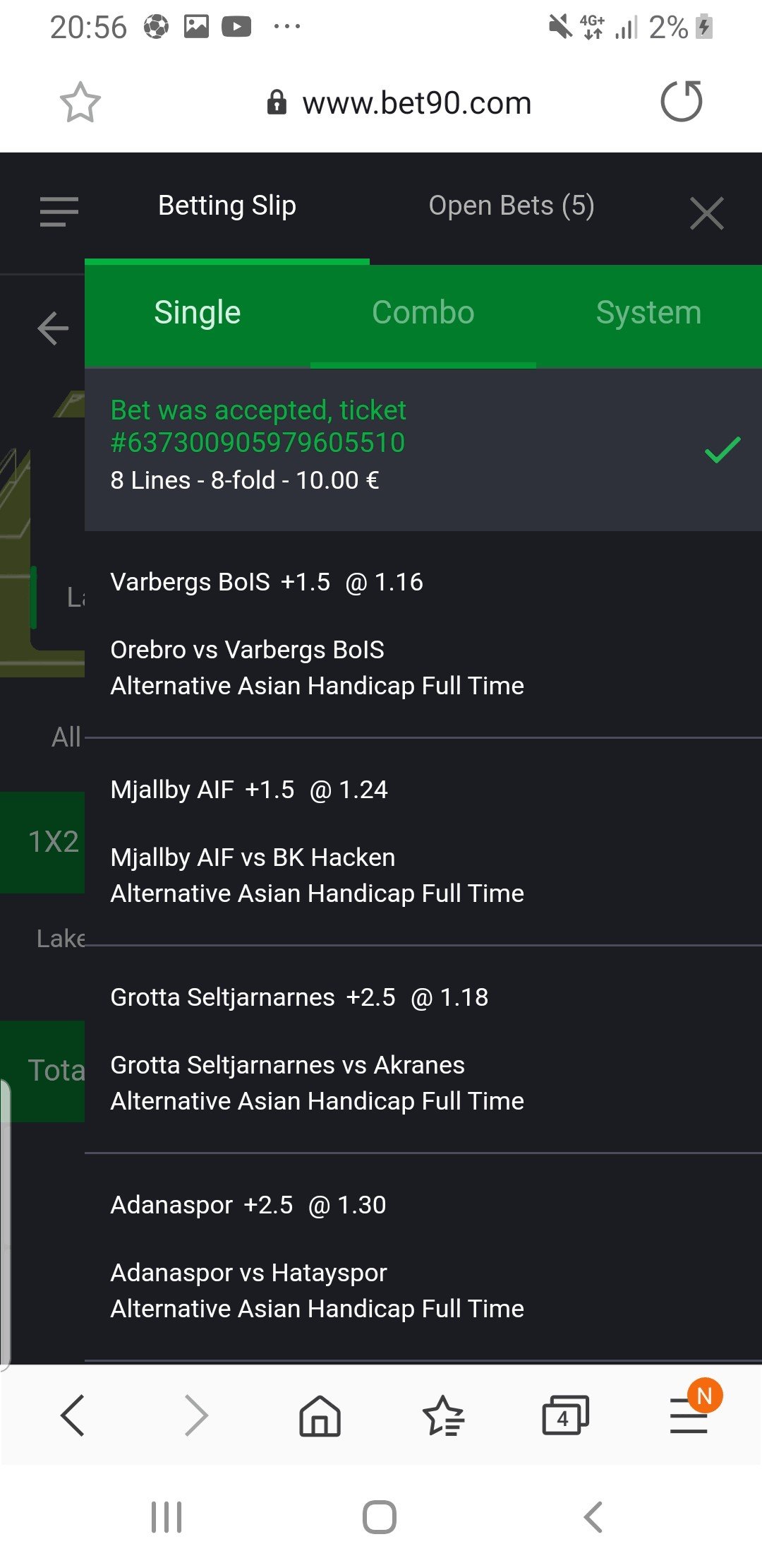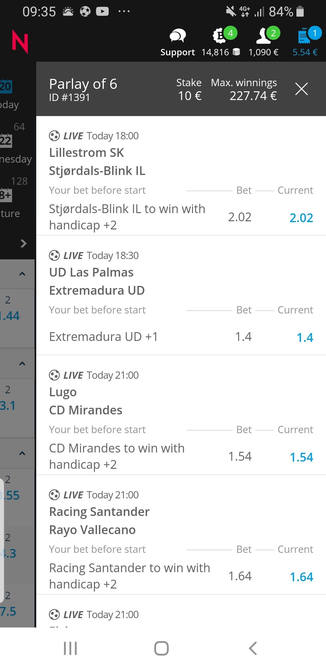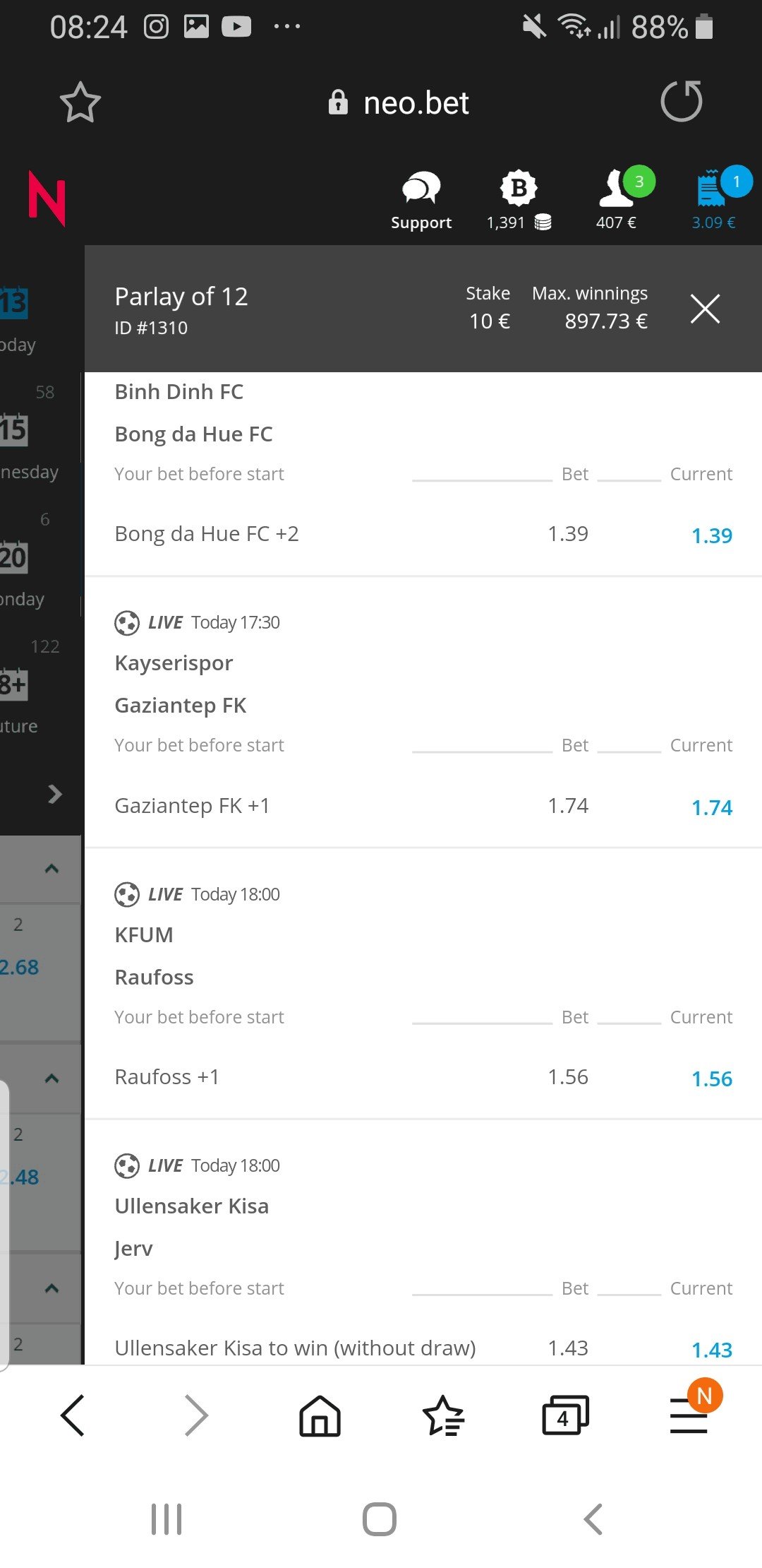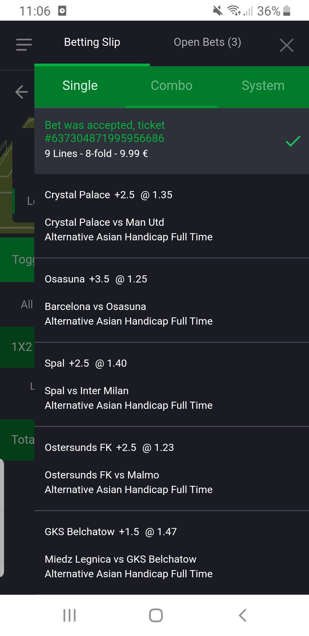 Hierboven de "safe" version ;) En als je de uitgebreidere versie wil (die heb ik ook) doe je Villarreal +0.5 hcp, Foutoua Club +1.5 hcp, Stjordals Blink +.1.5 hcp en Kasimpasa +0,5 hcp erbij. Dan heb je een 11 fold odd 42.