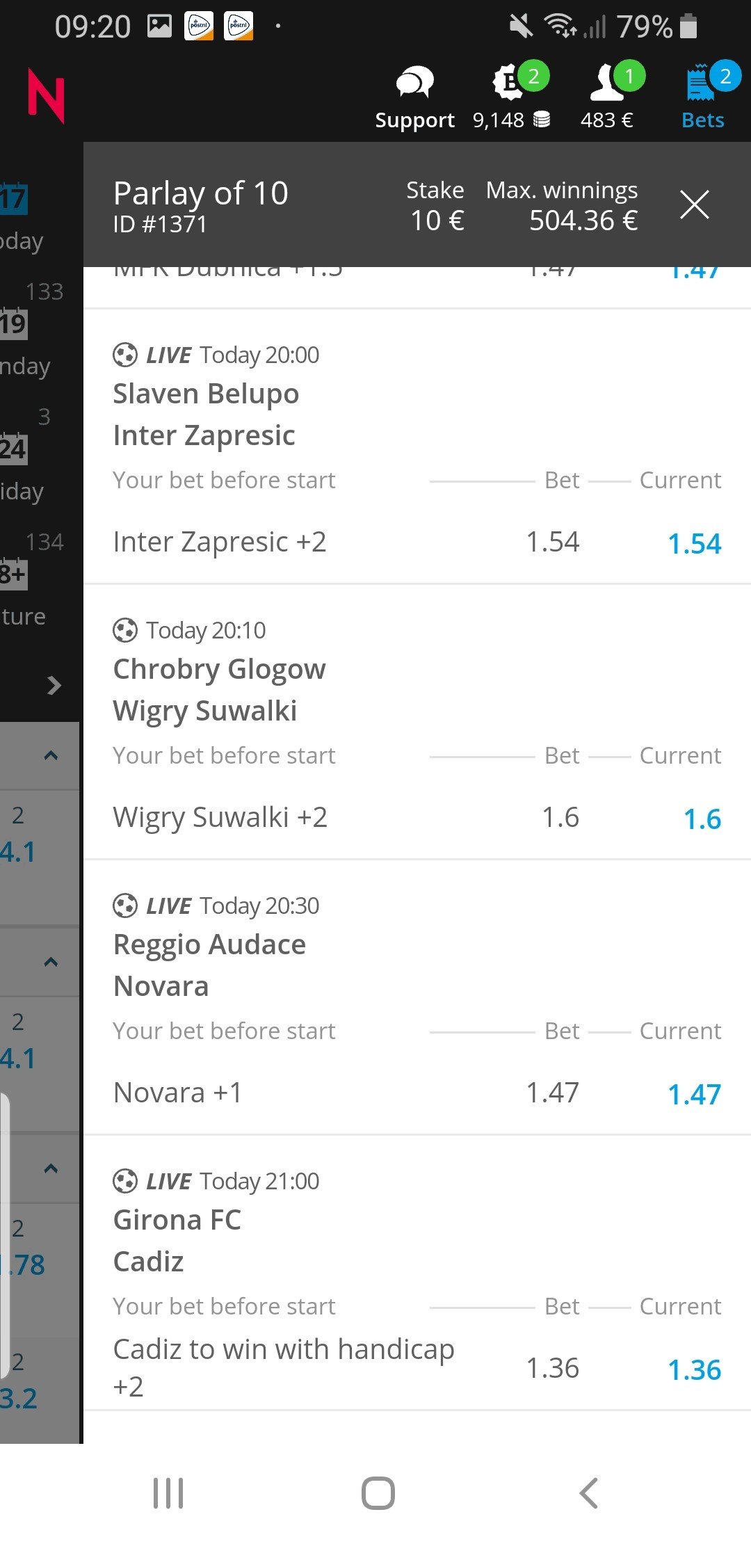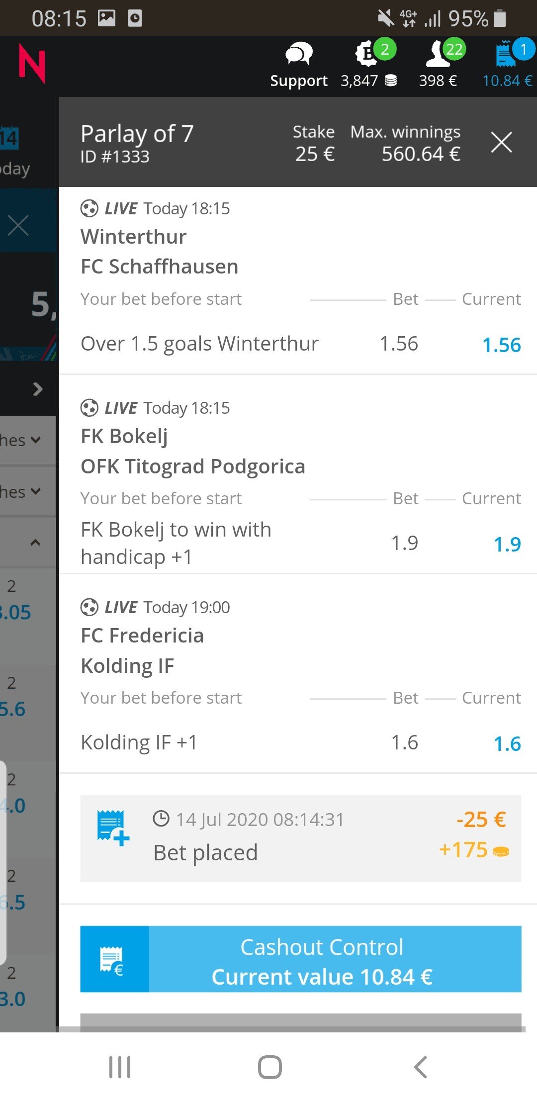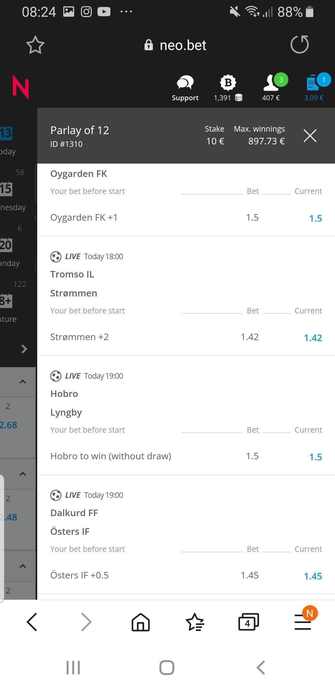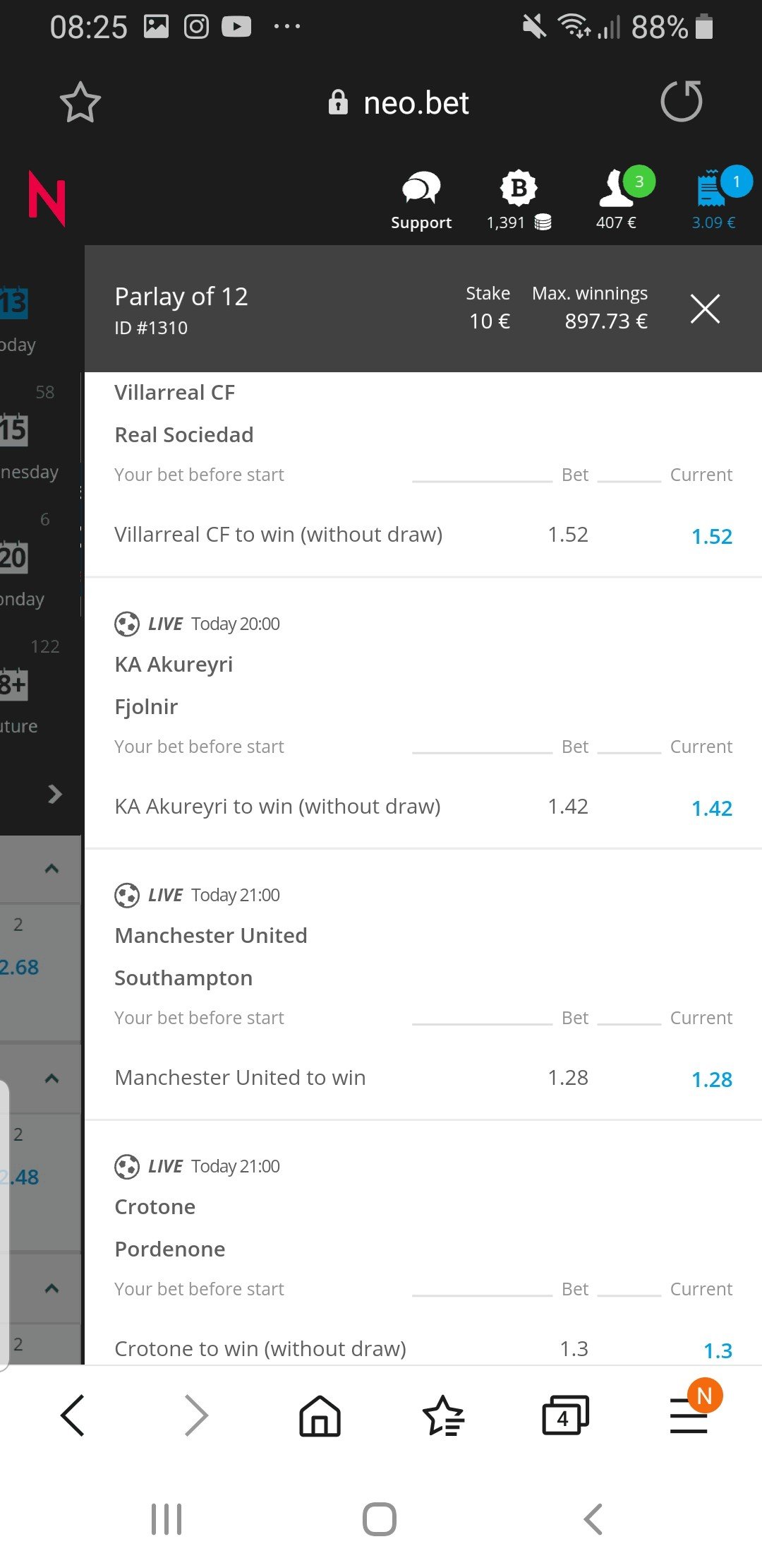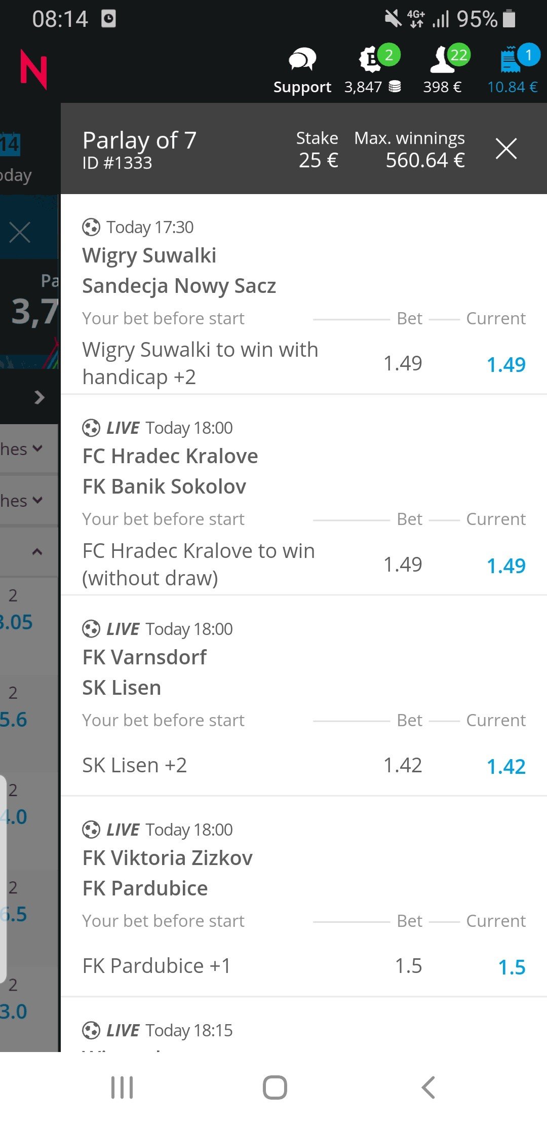 Hierboven de "safe" version ;) En als je de uitgebreidere versie wil (die heb ik ook) doe je Villarreal +0.5 hcp, Foutoua Club +1.5 hcp, Stjordals Blink +.1.5 hcp en Kasimpasa +0,5 hcp erbij. Dan heb je een 11 fold odd 42.