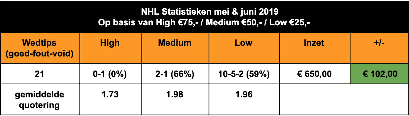 Voor het maandoverzicht heb ik mei en juni samengevoegd, omdat er in juni slechts een handvol tips waren. In beide maanden viel er een kleine winst te noteren. Morgenochtend volgt een korte terugblik op het afgelopen NHL-seizoen en een eindoverzicht wat betreft de wedtips.