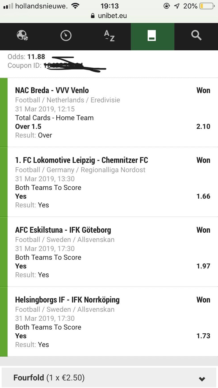 Avond heren, tis idd nu een aftertip ofja tip, meer het delen van mijn combi deze dag. Wegens tijdgebrek; voetbal, kantineren etc. ben ik vergeten mijn combi vandaag te delen. Ditmaal was ie wel correct! Gisteren helaas wel verloren(zie vorige post in dit forum). Vanaf morgen zal ik dagelijks weer men ?€˜Combi of the day?€™ posten.